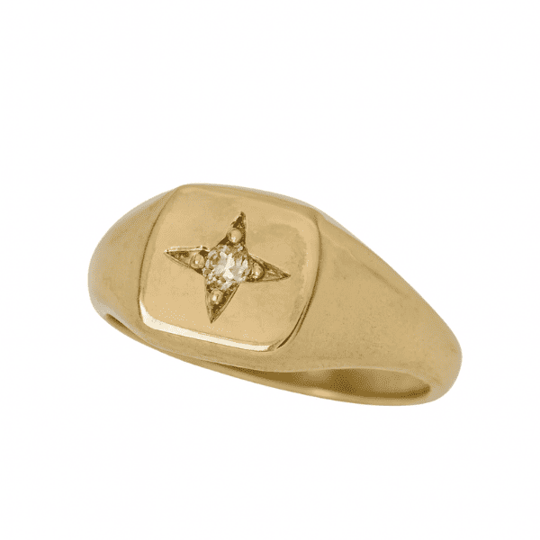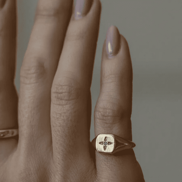 ➣ Anel tipo sinete, com superfície lisa e detalhe central em zircônia lapidada.