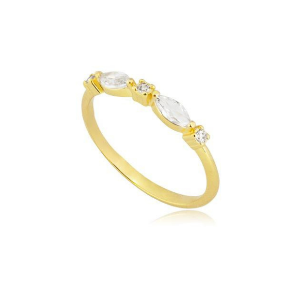 ➣ Anel com delicadas zircônias de lapidação marquise e redonda, dispostas em sequência no banho de ouro 18k.