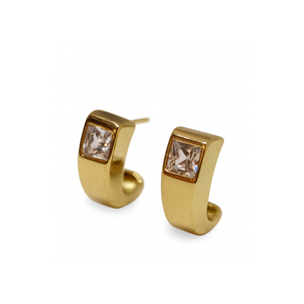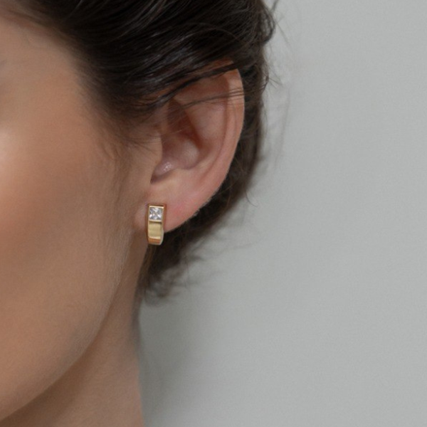 ➣ Brinco de estrutura robusta em formato levemente curvado de meia argola, com linhas suaves, acabamento polido e pedra quadrada cravejada na parte frontal.