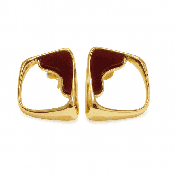 ➣ Brinco com design geométrico orgânico, estrutura dourada de bordas suaves e interior preenchido em resina marrom.