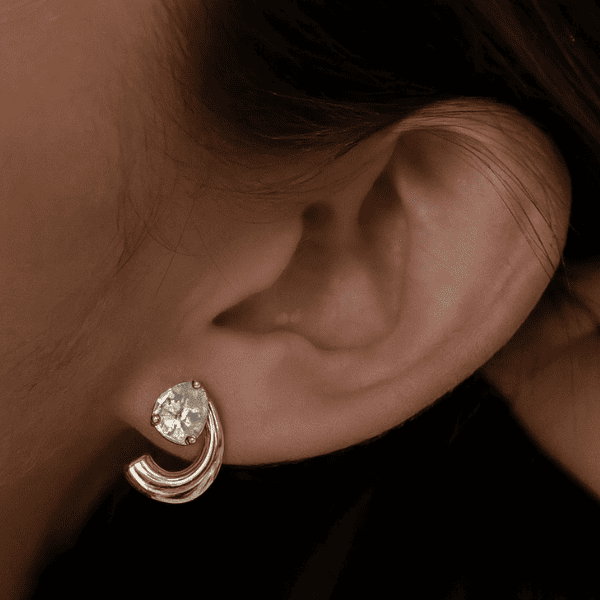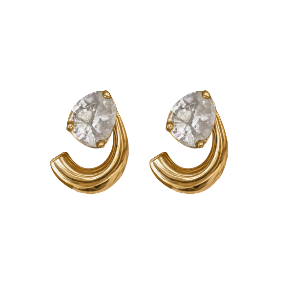 ➣ Brinco composto por uma pedra central redonda de brilho intenso e uma base curvada em formato de meia lua com acabamento polido em banho de ouro 18k