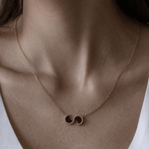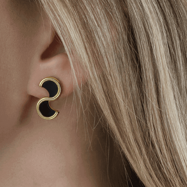 ➣ Colar e Brinco banhados a ouro 18k com pingente em formato fluido e simétrico com resina na cor preta.