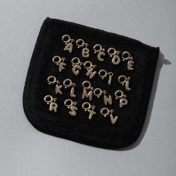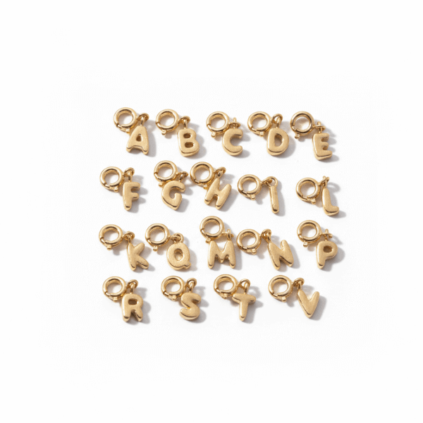 ➣ Pingentes individuais em formato de letra, desenvolvidos em banho de ouro 18k, com acabamento polido e volumetria sutil.